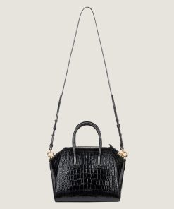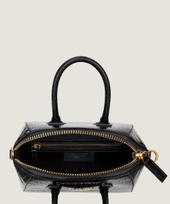 - Crocodile-effect embossed leather handles.