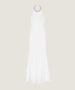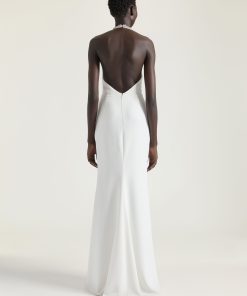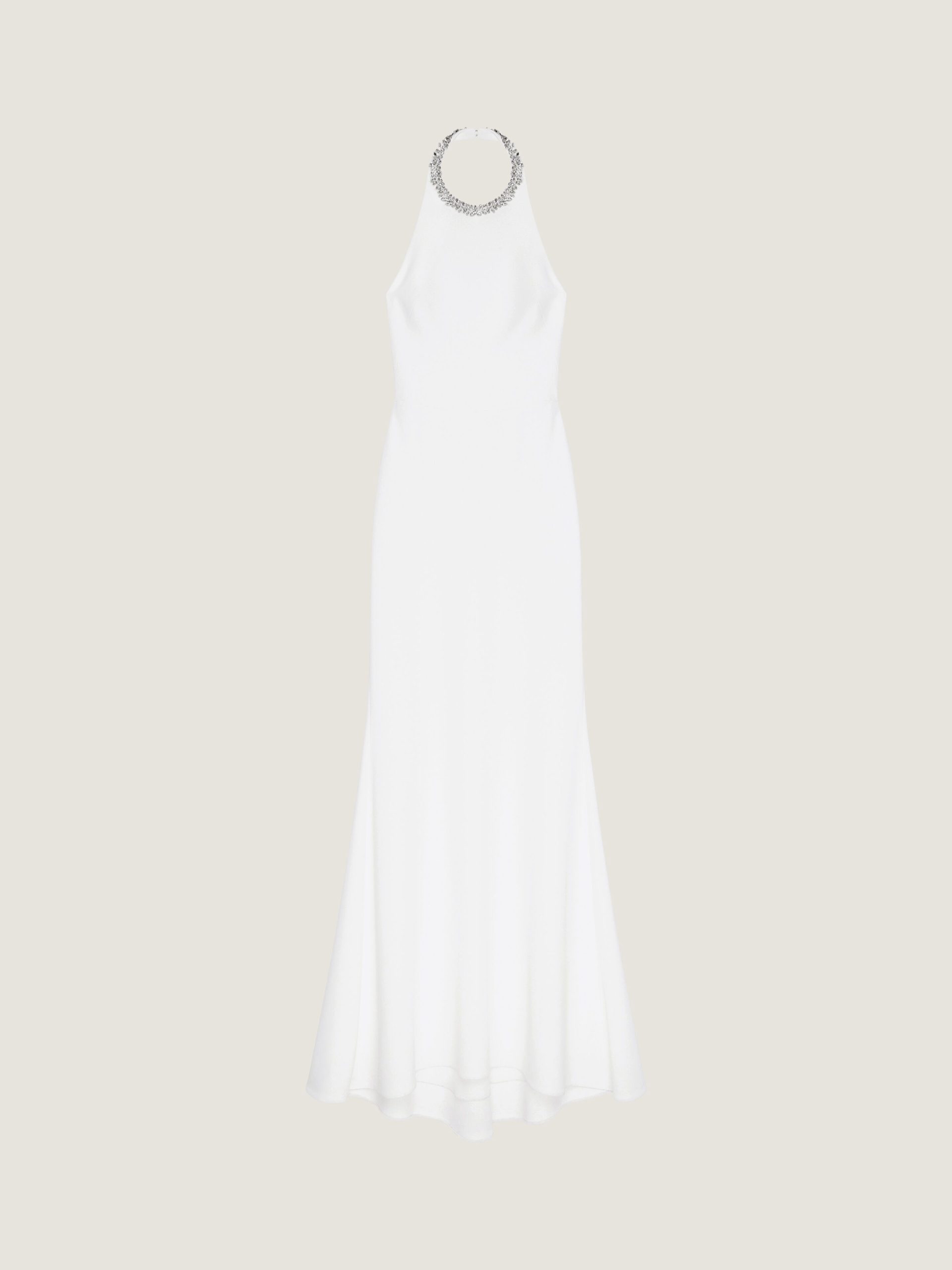 - Invisible zipped closure on the back and hook at neck.