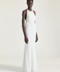 - Invisible zipped closure on the back and hook at neck.